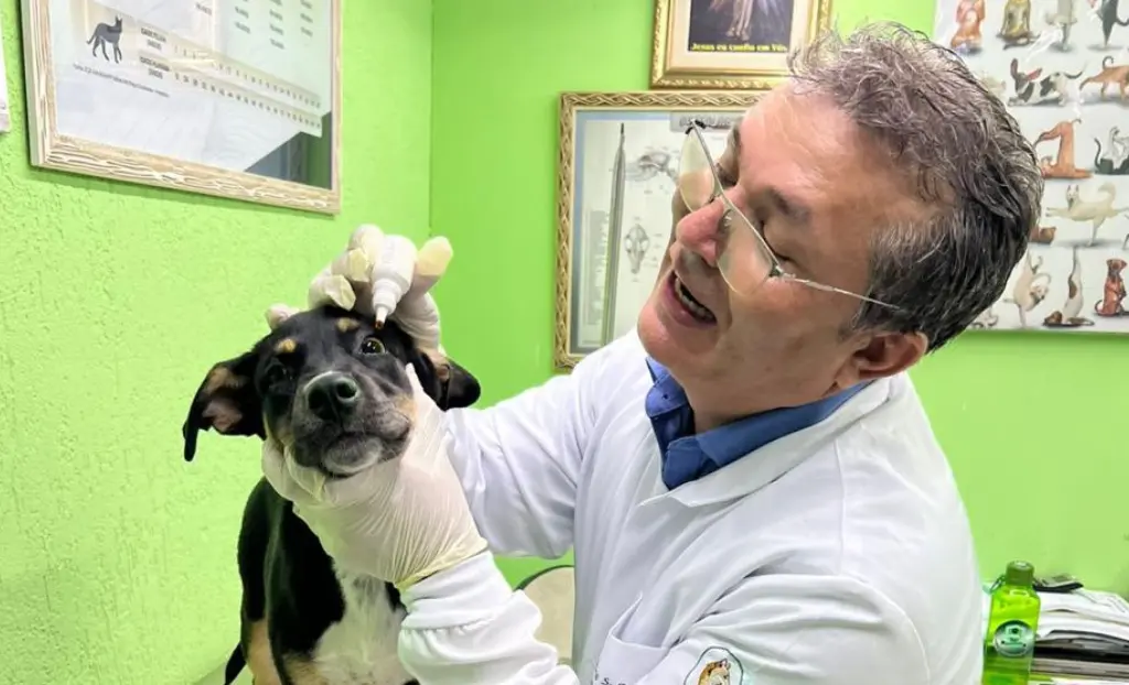 - Caso haja secreção ocular, realizar limpeza prévia com gaze estéril e soro fisiológico 0,9%, quando orientado pelo médico-veterinário.
