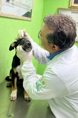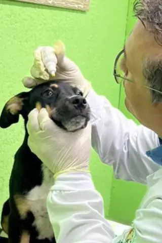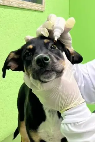 - Caso haja secreção ocular, realizar limpeza prévia com gaze estéril e soro fisiológico 0,9%, quando orientado pelo médico-veterinário.